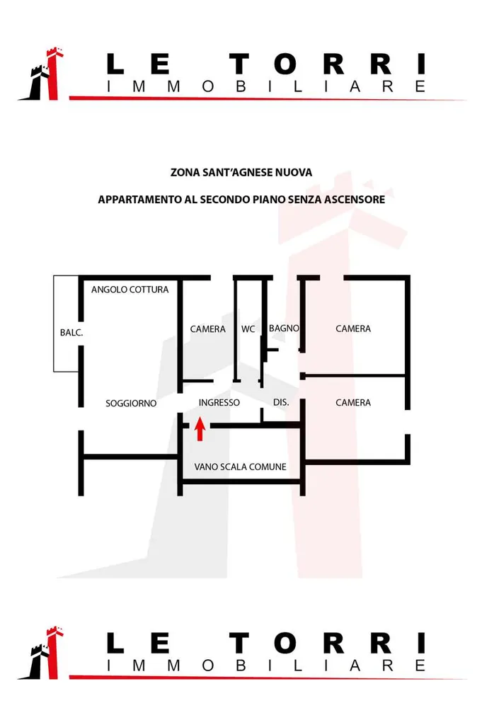 L'immobile è così distribuito: Ingresso, soggiorno con angolo cottura e balcone, tre camere da letto di cui una singola, due bagni.