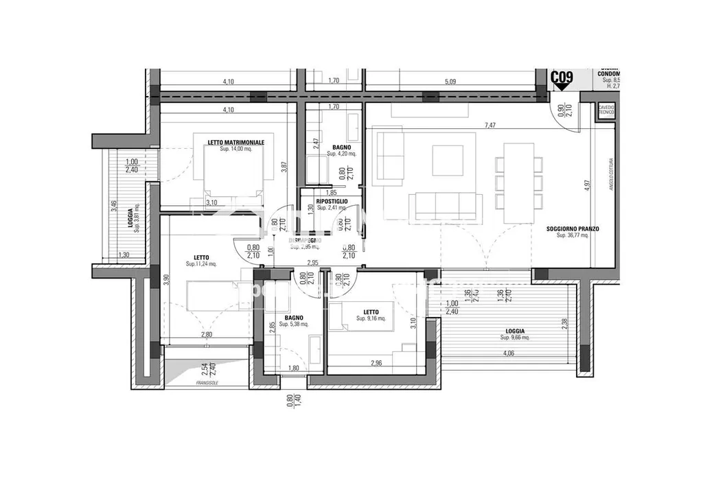 Appartamento così disposto: soggiorno/pranzo con cucina a vista, loggia, disimpegno, tre camere da letto (di cui una dotata di loggia), due bagni e ripostiglio.