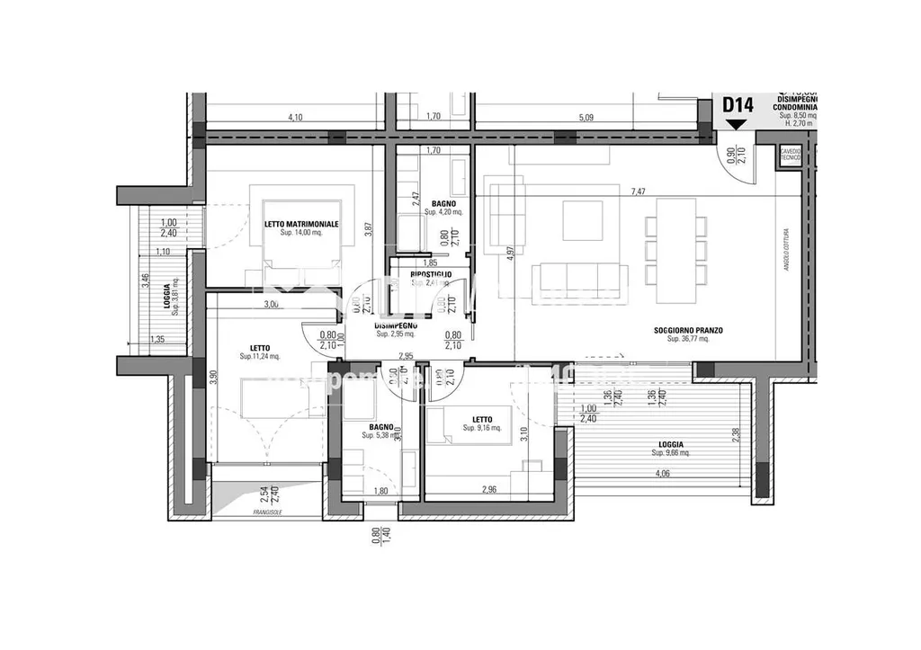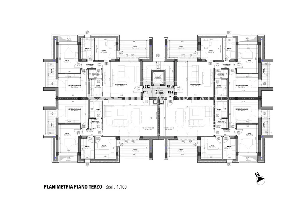 Appartamento così disposto: soggiorno/pranzo con cucina a vista, loggia, disimpegno, tre camere da letto (di cui una dotata di loggia), due bagni e ripostiglio.