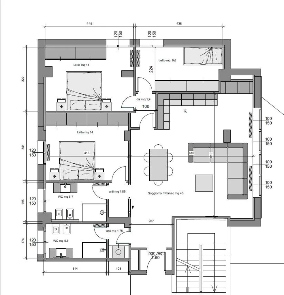 L'immobile è così distribuito: ingresso in luminosa zona living con angolo cottura, tre camere da letto (due matrimoniali ed una singola), due bagni finestrati.