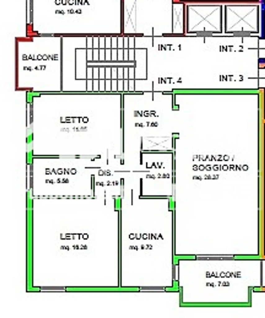 Ingresso, salone con terrazzino, cucina abitabile, due camere da letto, bagno finestrato con doccia, bagno di servizio cieco.