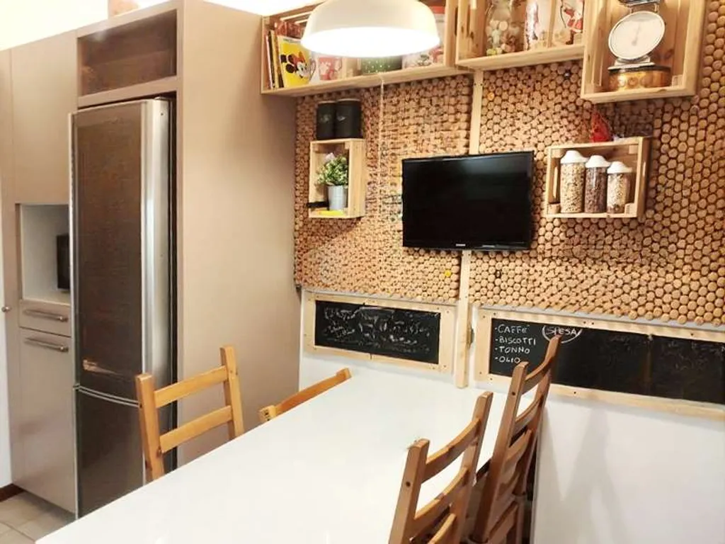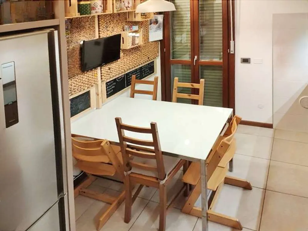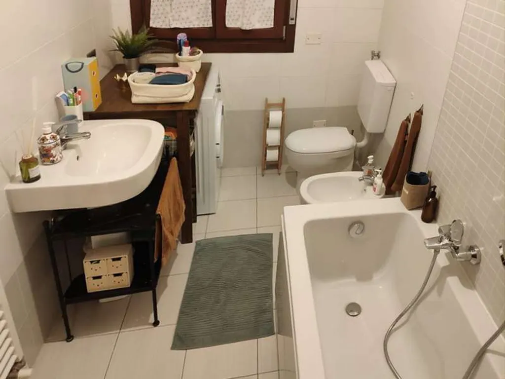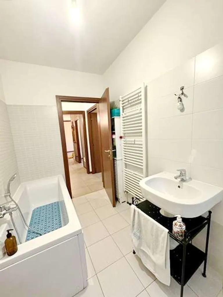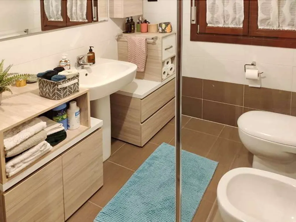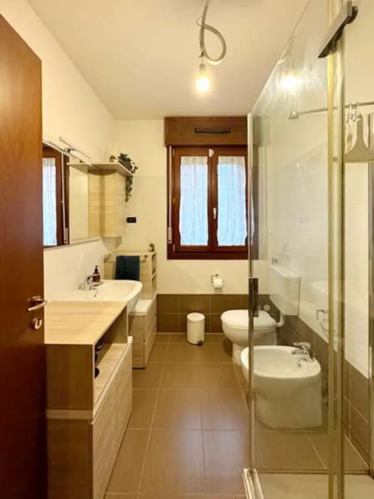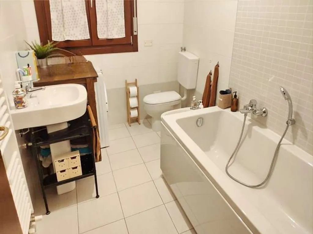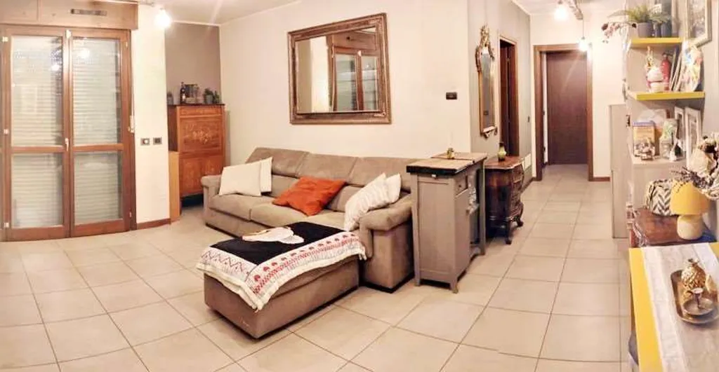 L'appartamento molto luminoso con esposizione est/sud/ovest è così composto : ingresso in soggiorno, cucina abitabile, due bagni, due camere matrimoniali, una camera 3/4, ripostiglio. Come pertinenze abbiamo un'ampia soffitta luminosa, pavimentata e con finestra, che vista l'altezza può essere sfruttata come studio o palestra, oltre ad una grande cantina ed un garage DOPPIO con due ingressi.