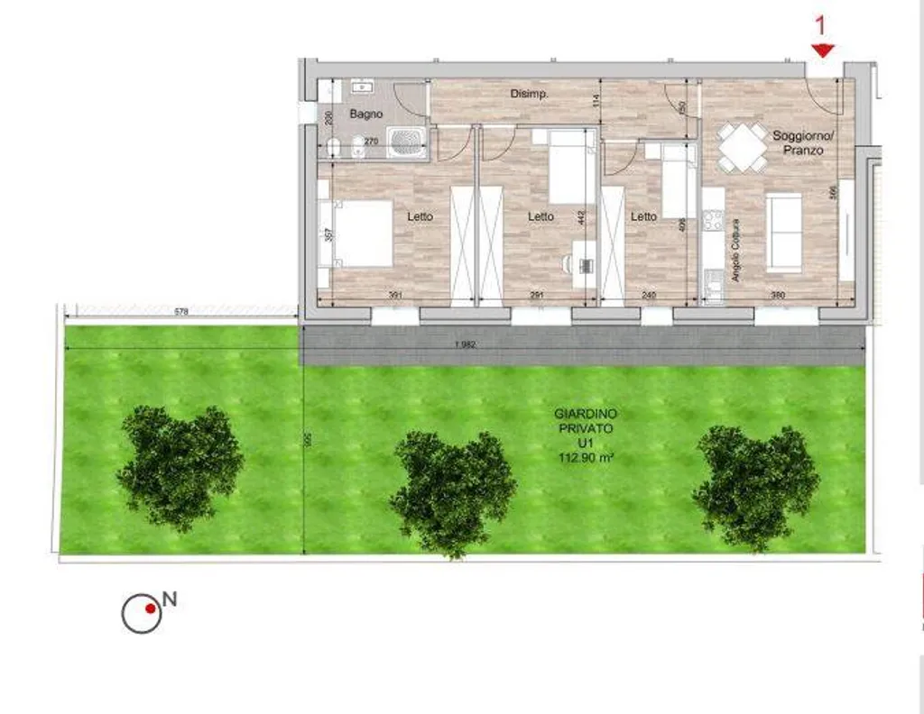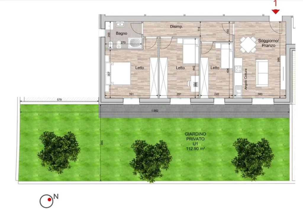 L'immobile si suddivide in ingresso su soggiorno con angolo cottura ed accesso al giardino, corridoio e disimpegno notte, bagno finestrato, 3 camere da letto (due singole ed una matrimoniale) tutte con affaccio sul giardino.