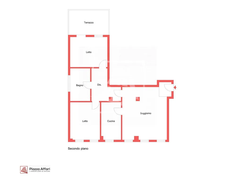 L'immobile è composto da ingresso su ampio soggiorno, cucina abitabile, disimpegno che separa la zona notte, due camere matrimoniali ed ampio bagno con finestra (è possibile realizzare il secondo bagno).