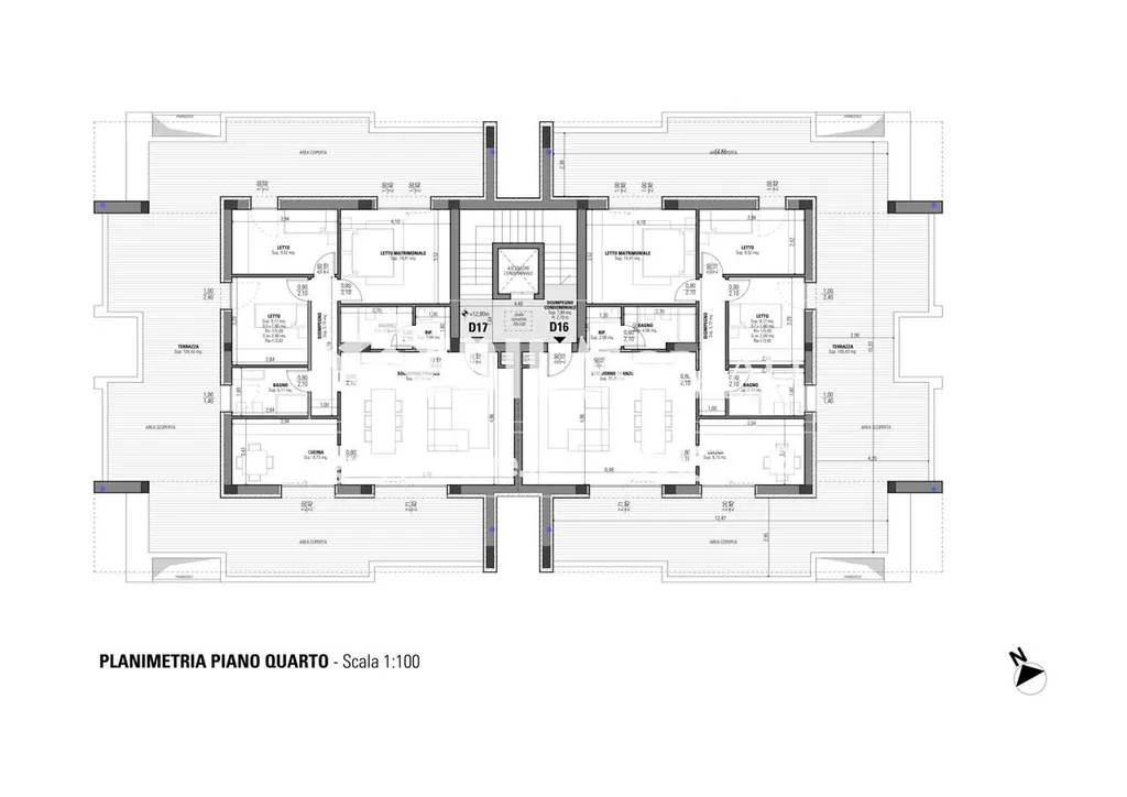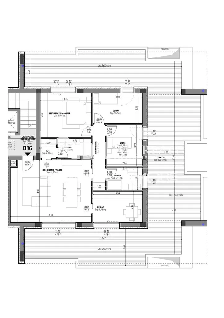 Appartamento così disposto: soggiorno/pranzo, cucina, disimpegno, tre camere da letto (con affaccio su terrazzo), due bagni, ripostiglio e ampio terrazzo perimetrale.