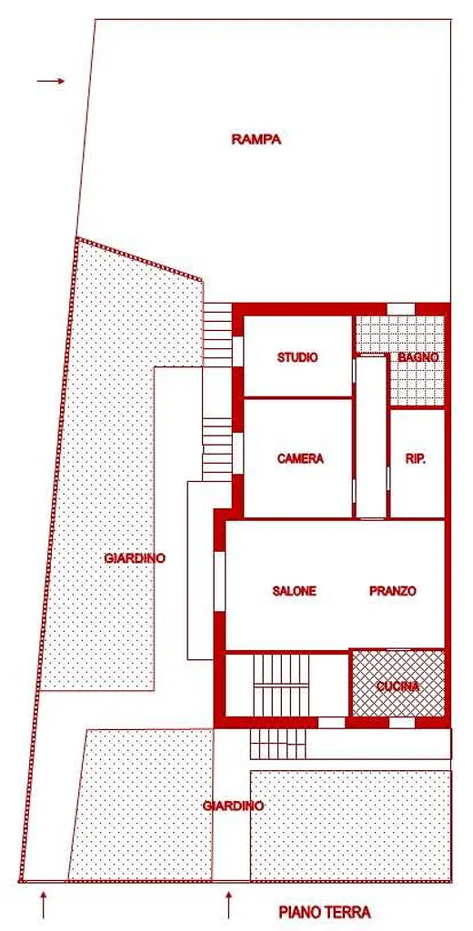 P. Terra - ingresso dal giardino su ampia zona pranzo/soggiorno con balcone, cucina abitabile, disimpegno notte, studio, bagno e ripostiglio.