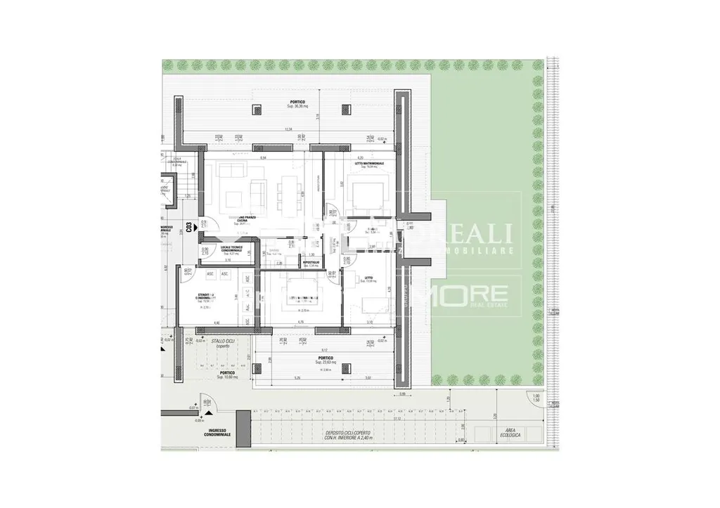 Appartamento così disposto: soggiorno/pranzo con cucina a vista, portico, giardino perimetrale, disimpegno, tre camere da letto (di cui dotate di portico), due bagni e ripostiglio.