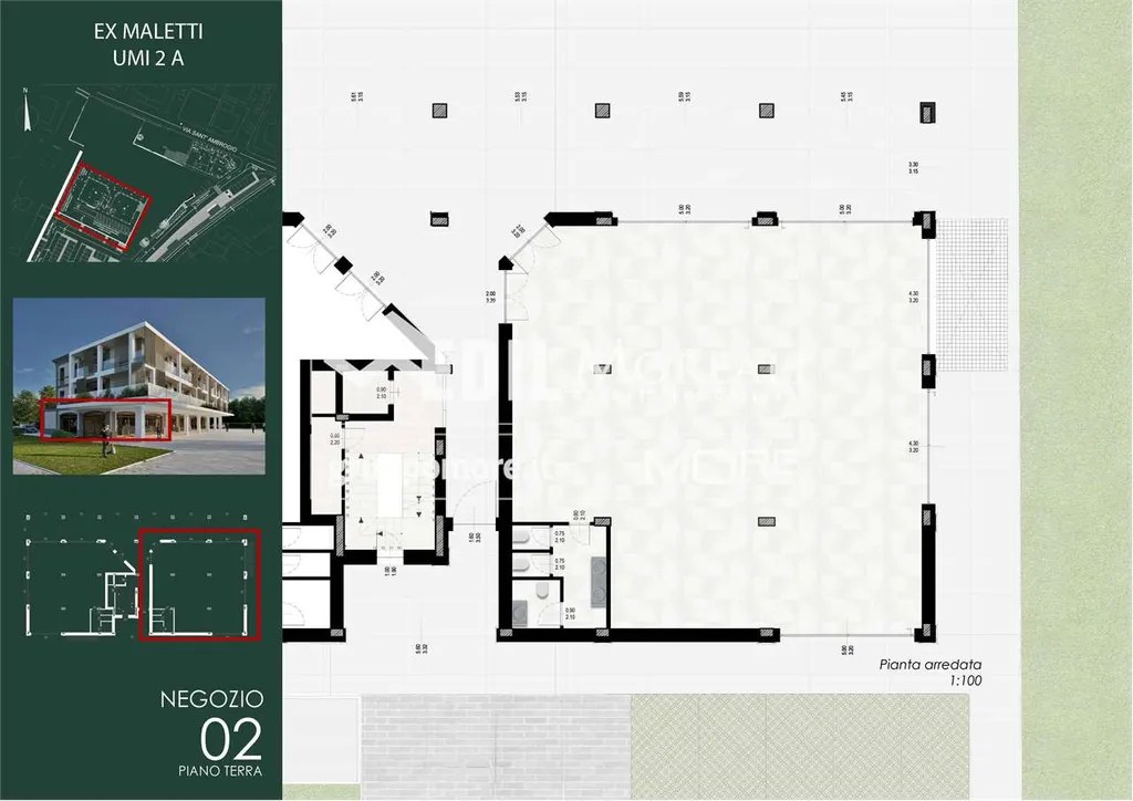 Rif. MO860-UMI2A(N02) - MO860-UMI2A(N02). Nostra esclusiva, Casinalbo, Borgo San Luigi - Ex Salumificio Maletti, in angolo verde comodo a tutti i servizi prossima realizzazione di comparto residenziale (Classe Energetica A4 - NZEB) composto da nr. 9 palazzine e due ville indipendenti. Al piano terra della palazzina UMI2A vendesi negozio "N02" di 255 mq. con ampie vetrate e affaccio su piazza.