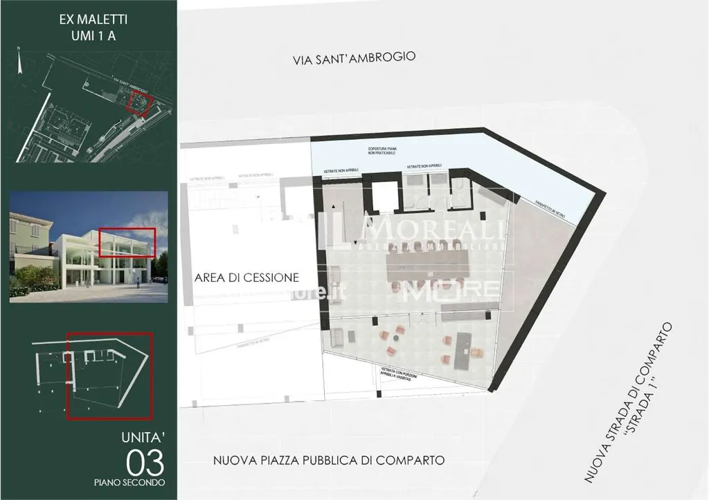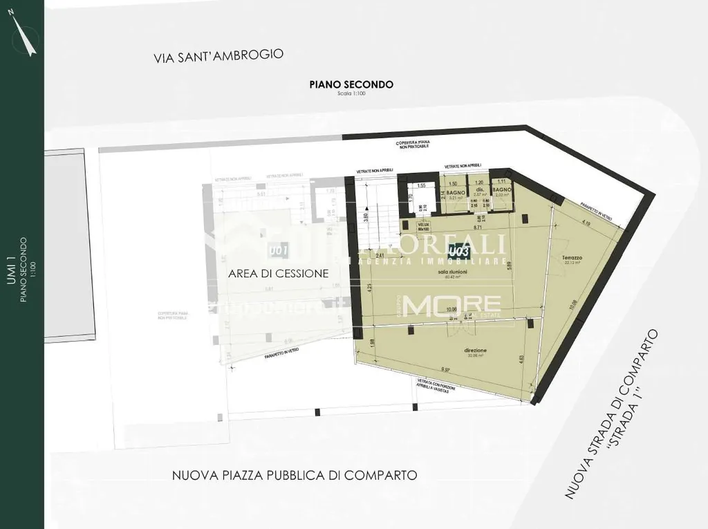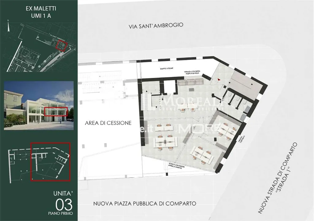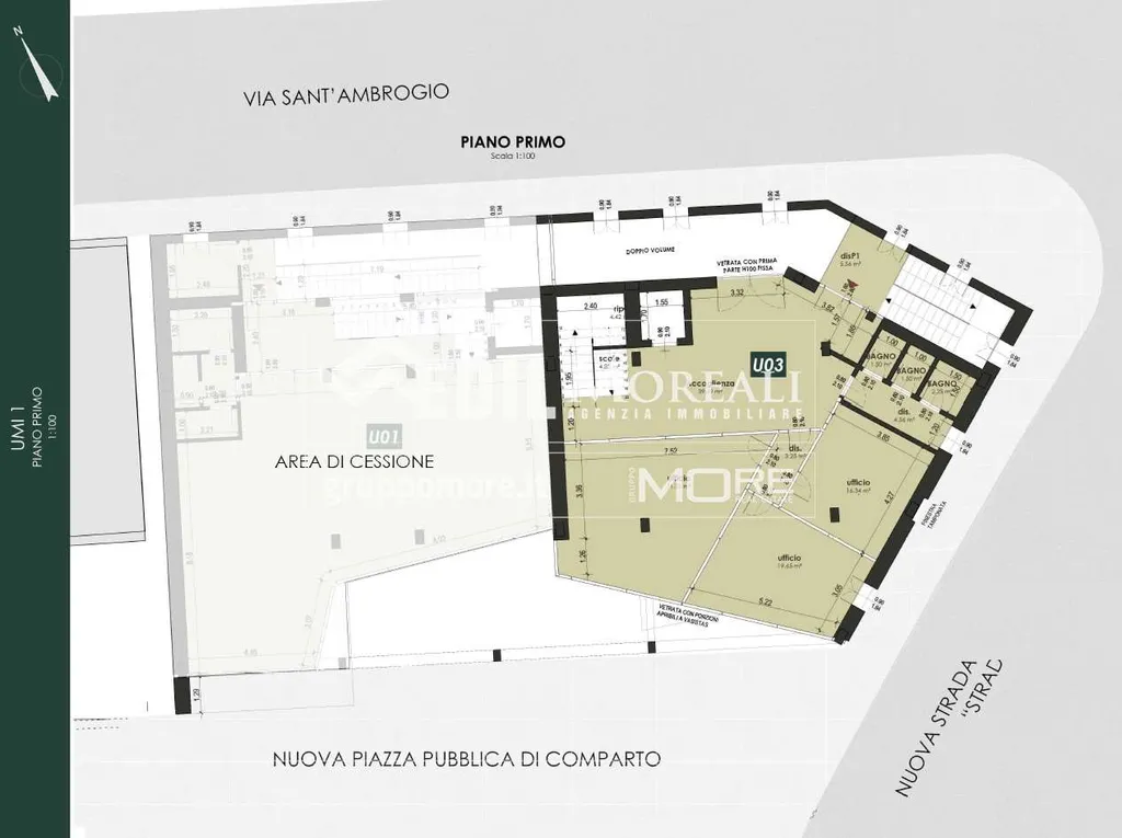 Al primo piano della palazzina UMI1A vendesi ufficio "U3" di 298 mq. su due livelli (piani 1° e 2°) dotato di ingresso indipendente e ampie vetrate.