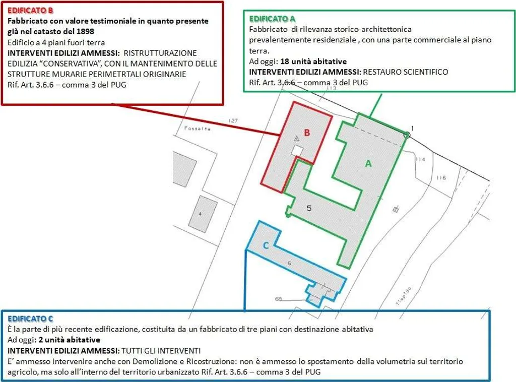 Il complesso attualmente si compone di tre edifici per un totale di circa 20 unità immobiliari, con possibilità di ampliamento e ridefinizione delle unità abitative nellambito di un progetto di ristrutturazione e valorizzazione complessiva.