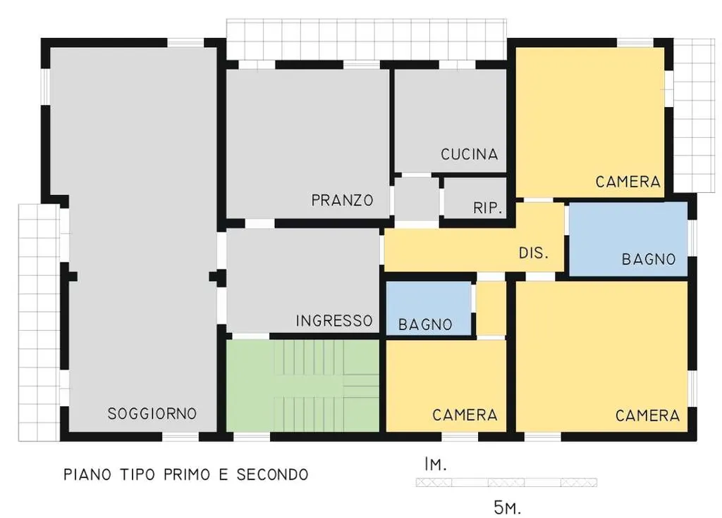 Primo e secondo piano: due appartamenti gemelli di generose dimensioni, caratterizzati da una distribuzione razionale e luminosa. Entrambi offrono un salone di rappresentanza, cucina abitabile, tinello, sala da pranzo, tre camere matrimoniali e doppi servizi.