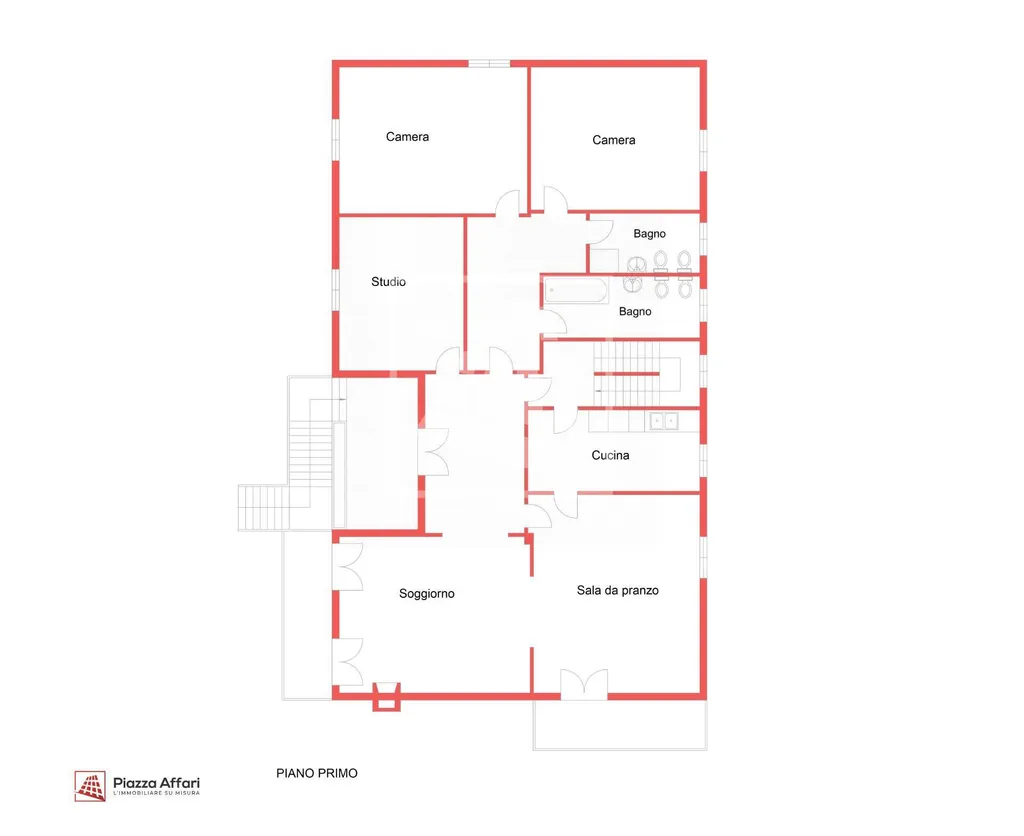 Salendo al primo piano, collegato anche da scala esterna rendendolo quindi eventualmente indipendente, si trovano un ampio salone, sala da pranzo, cucina abitabile, due balconi e bagno finestrato; proseguendo nella zona notte si trovano tre camere da letto e secondo bagno finestrato.
