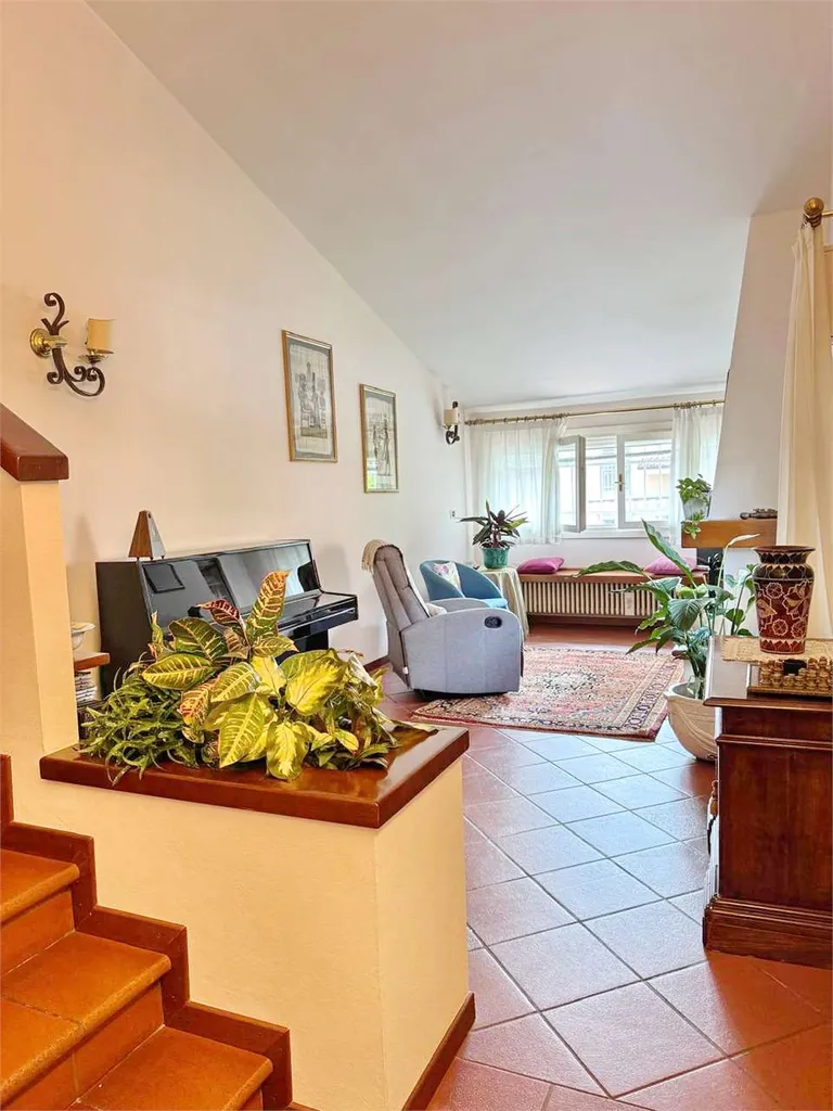 L'immobile tenuto in maniera maniacale è così composto: Piano terra rialzato con ingresso in ampio salone/soggiorno, comoda cucina con zona pranzo dalla quale si accede al giardino sul retro, disimpegno che porta al bagno, alla lavanderia ed al garage. Al 1° Piano troviamo una mansarda con camino, le tre camere di cui 2 matrimoniali ed 1 3/4, ed i bagni di cui 1 con doccia ed 1 con vasca.