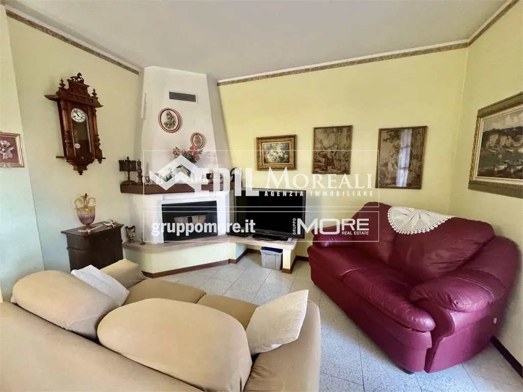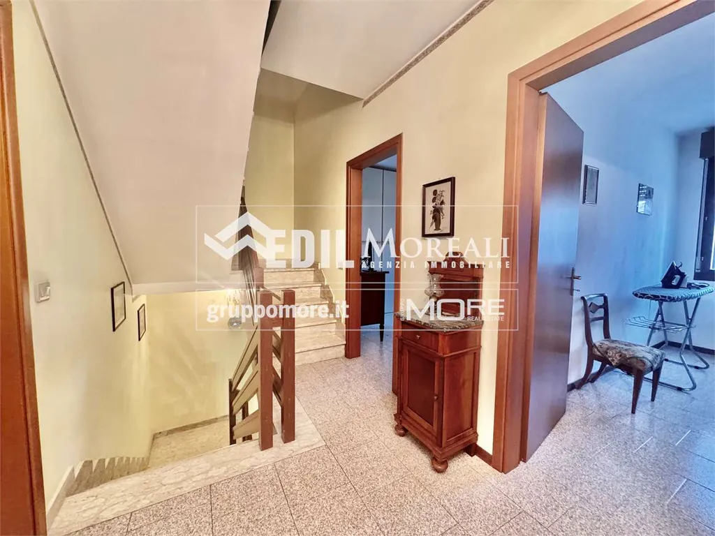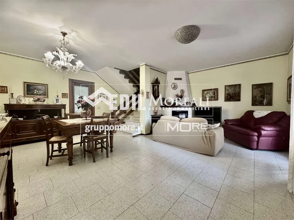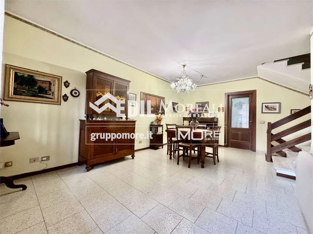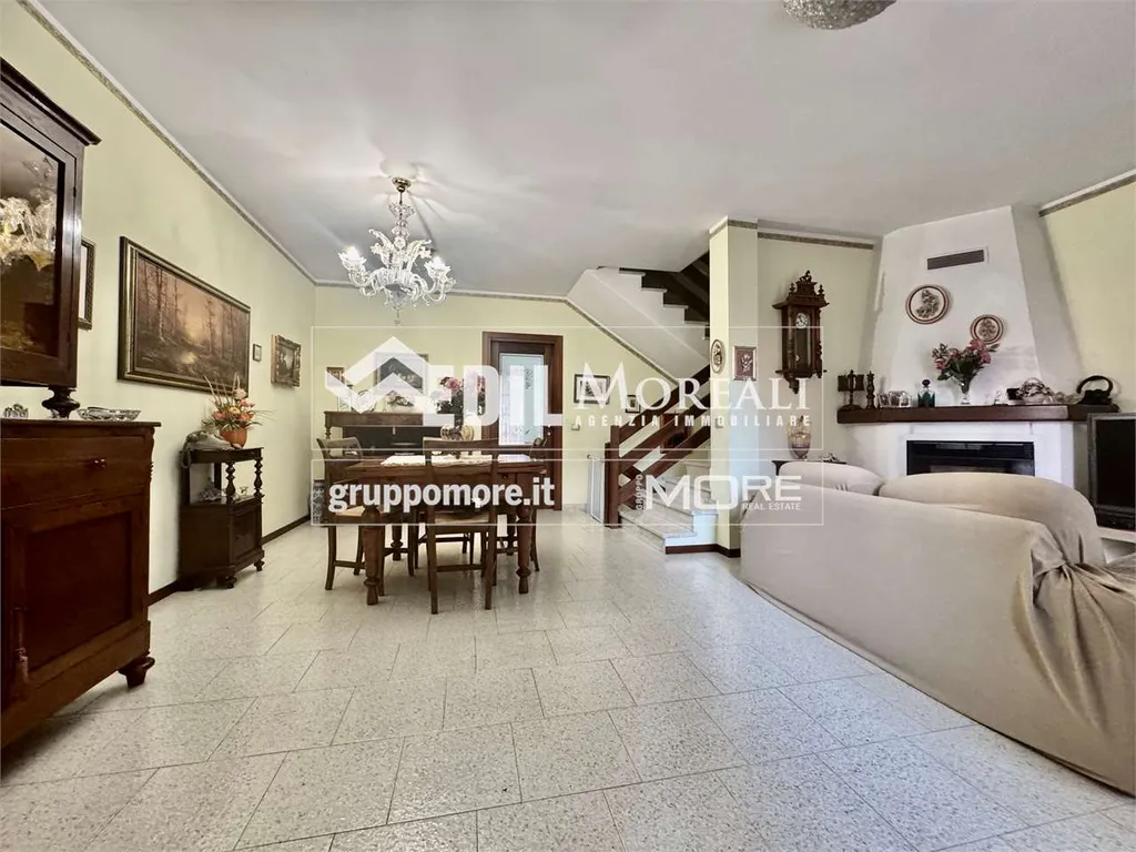 Villetta così composta; piano rialzato: ampio soggiorno con camino, una cucina abitabile e bagno; primo piano: una comoda zona notte con due camere matrimoniali e una camera singola, balcone e bagno; secondo piano: ampia zona open-space mansardata con lavanderia. Completa la proprietà un box auto privato e un'ampia cantina.
