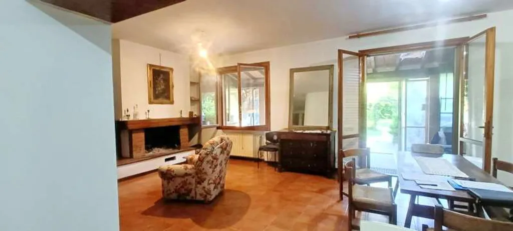 Salone con camino e accesso diretto al portico e al giardino privato posteriore