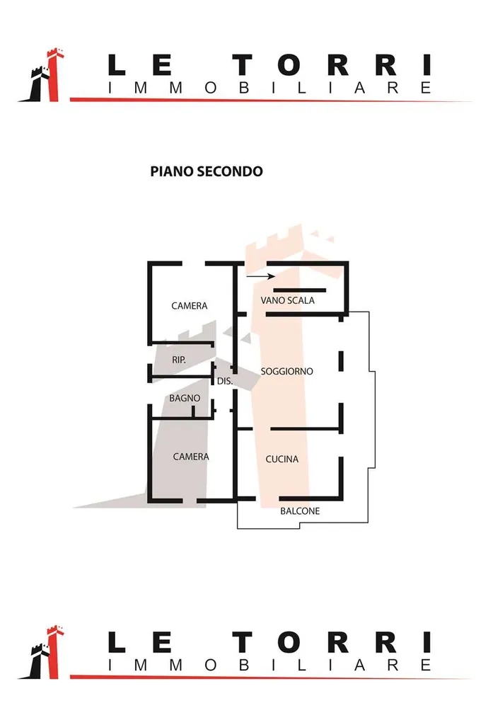 Piano secondo - ingresso nel soggiorno con balcone, cucina abitabile con affaccio sul balcone, tre camere da letto, un bagno.